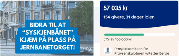 Vi nærmer oss nå full-finansiering av skulpturprosjektet. Folkefinansieringen/ Speisen går nå, og det går svært bra. Faktisk er det bare noen få tusen kroner som mangler. Målsettingen var å hente 100.000 kroner via Spleis. Vi er svært fornøyd med at vi allerede har passert 57.000 kroner. Som beskrevet annen plass på denne hjemmesiden har vi en "Matching Gift" -støtte fra Sparebank1 Østlandet, der banken dobler alle beløp som gis. Da monner det virkelig når man bidrar!