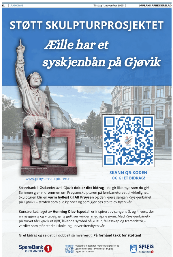 Prosjektkomiteen takker for imøtekommenhet i forbindelse med reaksjonell omtale, samt flotte helsides annonser til fordel for skulpturprosjektet i lokalavisene Oppland Arbeiderblad og Gjøviks Blad, samt i medlemsbladet PrøysenVennen, som utgis i Ringsaker.